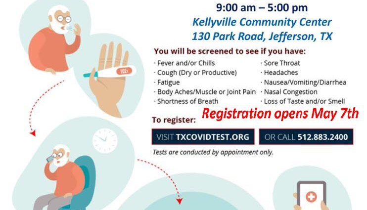 Mobile COVID-19 testing is returning to Marion County on Friday, May 8, 2020, at the Kellyville Community Center, and today is the first day the Texas Department of Emergency Management (TDEM) is allowing individuals to call in to signup for appointments.