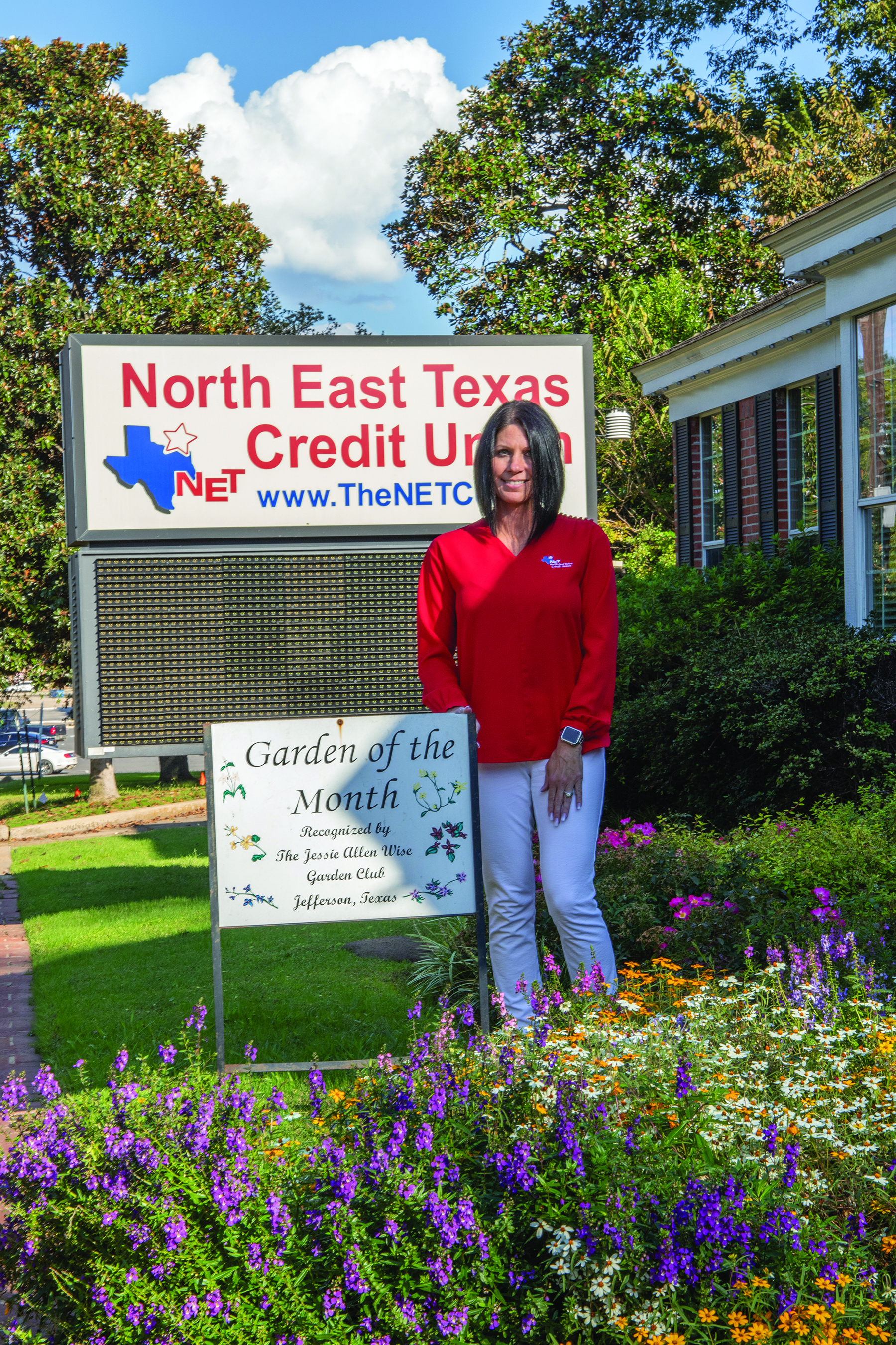 The Northeast Texas Credit Union on Broadway has been chosen as Garden of the Month for October by the Jessie Allen Wise Garden Club.  The Credit Union’s colorful garden contributes to the beautification of the city of Jefferson. Photo by Hollis Shadden