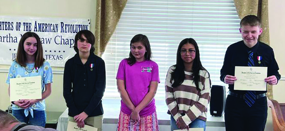 Recent winners of the Daughters of the American Revolution Essay contest winners at Jefferson ISD were 6th grader Kimberly Ball, 7th grader Eli Kendrick, 8th grader Natalie Peralta and 9th grader Braydon Thomas.