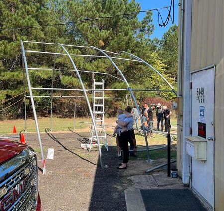 Volunteers at the Gray community are installing a new shelter at the Gray Volunteer Fire Department.