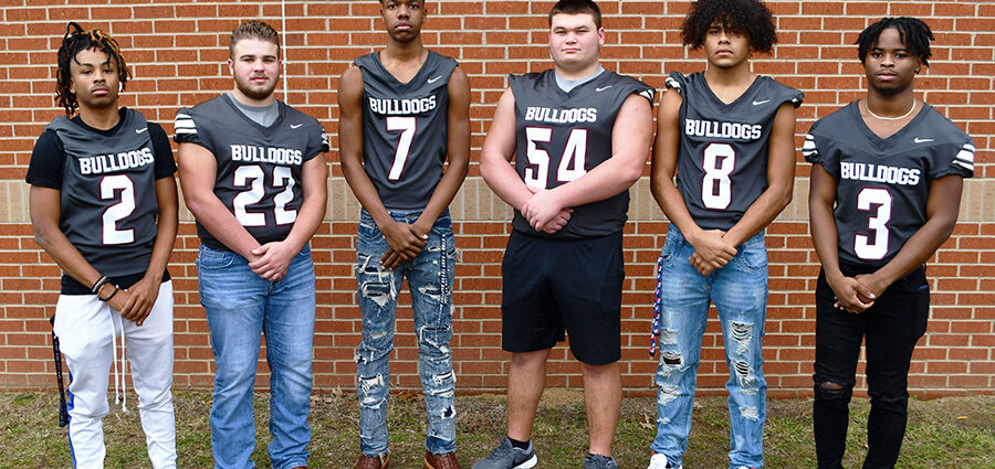 The Jefferson Bulldogs were well represented on the District 6-3A First Team roster. From left, senior Cortavion Massingill, First Team Defensive Back; senior Knox Tomlinson, First Team Running Back; senior Erik Burns, First Team Quarterback and First Team Defensive Back; junior Bryce Clark, First Team Offensive Lineman; senior Kenneth Ross, First Team Linebacker; and sophomore Kamran Williams, First Team Running Back. Not pictured are senior Knox Tomlinson, First Team Defensive Lineman; junior Judsen Carter, First Team Defensive Back; and senior Steve Washington, First Team Special Teams.