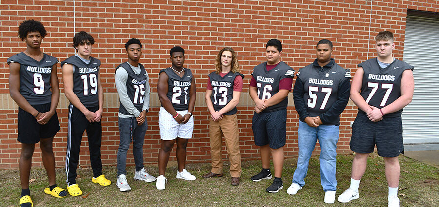 Ten  Bulldogs received Honorable Mention All-District Honors. From left, junior Anthony Flenoury, Honorable Mention Tight End, junior Joshaua Bittle, Honorable Mention Linebacker; senior Ashton Williams, Honorable Mention Reciever and Corner back; sophomore Chris Bowman, Honorable Mention Linebacker; senior Jace Lahay, Honorable Mention Running Back and Linebacker; junior Luis Gomez, Honorable Mention Offensive Lineman; freshman Keiland Williams, Honorable Mention Offensive Lineman; and sophomore Zack Hulscher, Honorable Mention Offensive Lineman. Not pictured are junior Aldarious Washington, Honorable Mention Defensive Lineman and junior Ronald Garrett, Jr.