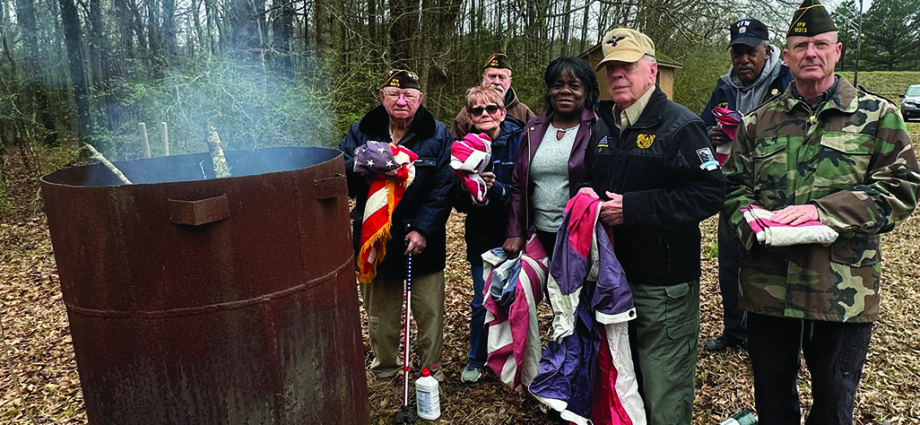 Above, VFW Post 10373 and the VFW Ladies Auxiliary held a Flag Retirement Ceremony on February 11 at the post.  “The US Flag should be treated with respect when it’s flying, and it should be treated with respect when it’s being retired,” said post commander John Cooper.  “When a flag is worn, torn, faded or badly soiled, it should be retired. If someone you know is flying a flag like this, it should be taken down and left down until it’s replaced. This is our duty.”
