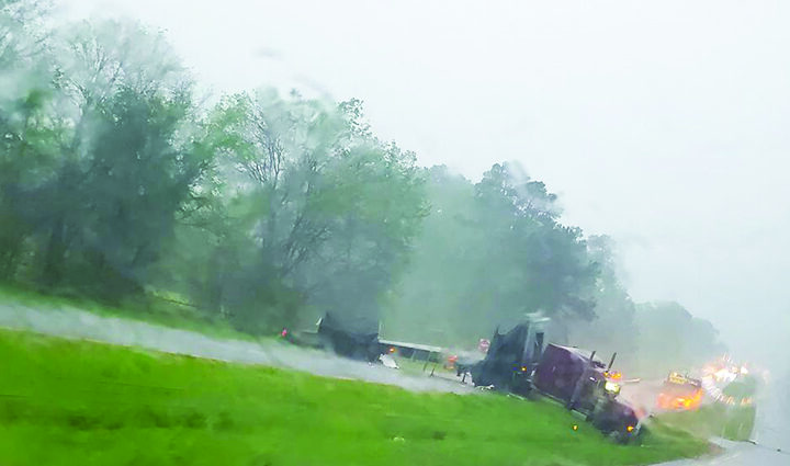 Sunday’s storms contributed to an 18-wheeler accident on US 59 just south of Jefferson blocking traffic for several hours, far right. The storms produced large hail, right, across much of the county, and caused tree and limb damage. A tornado was spotted east of Jefferson but was moving away from the city. The City emergency siren was sounded by JPD Chief Tino Perez out of an “abundance of Caution.” The City and County use the Smart 911 system for emergency notifications to reach a broader range of residents than the siren. Signup is free at smart911.com and can be customized to a location. Notifications include text, voice, app and website.