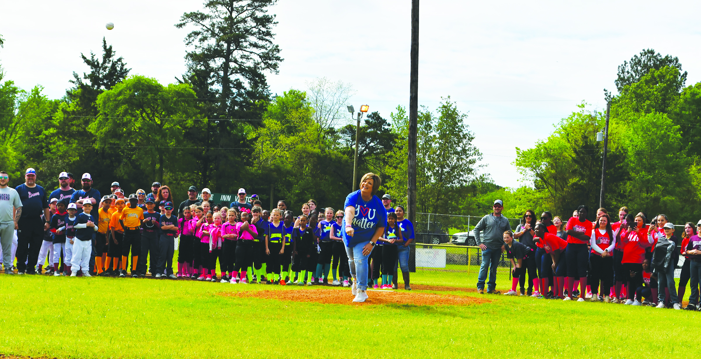 JES 4th grade teacher Mrs. Melinda Muphy throws out the first pitch at last Saturday’s Dixie Youth Baseball and Softball Association’s Opening Day. This year there are over 300 youth playing ball. Games are played at the Kellyville Ballpark every Saturday and in the evenings throughout the week.