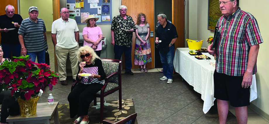 Bob Thomas, far right, speaks during a reception Tuesday evening to celebrate the completion of the first two “Windows Into History” art installations. The pieces are steamboat artwork etched into glass and located at the Port Jefferson waterfront park in downtown. The concept is one can look through the windows and see what the area looked like in the past. Additional windows are in the works.