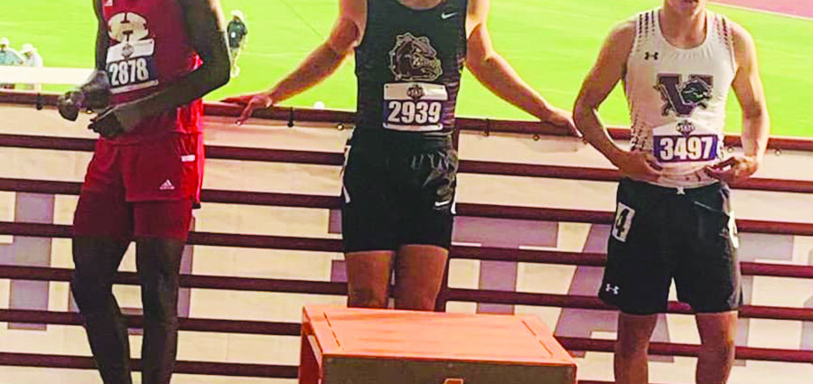 Jefferson High School senior Luke McMullen (center) prepares to take to the winners’ podium after he placed 1st in the 100m dash with a time of 10.51 and 1st in the 200m dash with a time of 21.23 last weeka the UIL State Track Meet in Austin .