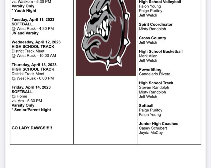 Toby Rhodes /Jefferson Jimplecute  The Lady Bulldogs dropped their final two games of the season after a 15-13 win over Waskom. Two big innings, one in each game proved too much for them to overcome losing 15-0 at West Rusk and 10-0 in their final home game hosting Arp. Jefferson @Continue Reading
