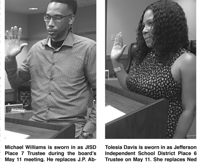 Jennifer Middleton/Jefferson Jimplecute Two new board members were sworn in May 11 during Jefferson Independent School District’s regular board of trustees meeting. Toleshia Davis and Michael Williams were sworn in to replace former Board Members Ned Frantangelo and J.P. Abernathy, who had served a combination of 31 years on theContinue Reading