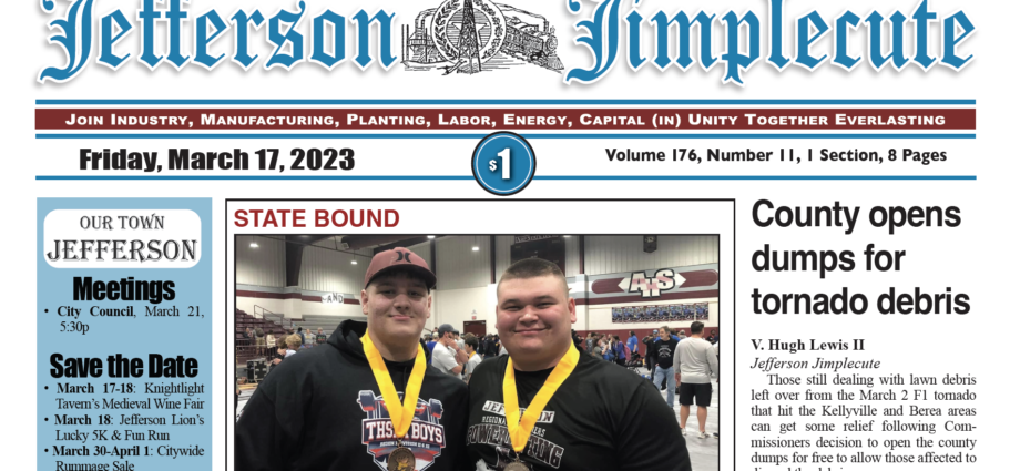Staff Report Jefferson Jimpleucte The turning of the clock and advancing of the New Year brings cause to celebrate for the Jefferson Jimplecute.  This issue marks the first of the 175th volume of the fourth oldest newspaper in Texas.  The Jimplecute has been the paper of record for Jefferson and Marion CountyContinue Reading