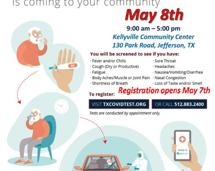 Mobile COVID-19 testing is returning to Marion County on Friday, May 8, 2020, at the Kellyville Community Center, and today is the first day the Texas Department of Emergency Management (TDEM) is allowing individuals to call in to signup for appointments. A pre-screening is required before an appointment can beContinue Reading