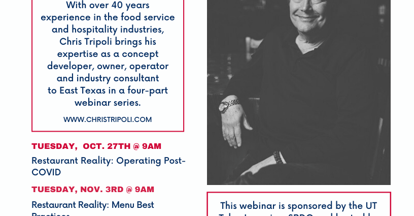 From UT Tyler-Longview SBDC The Chris Tripoli “Restaurant Reality” webinar series is in one week! The webinar begins at 9 a.m. Tuesday, October 27. Topics include: Operating Post Covid, Menu Best Practices, Marketing Best Practices, The Future of Service. The cost is $20 and also includes four additional recorded webinarsContinue Reading